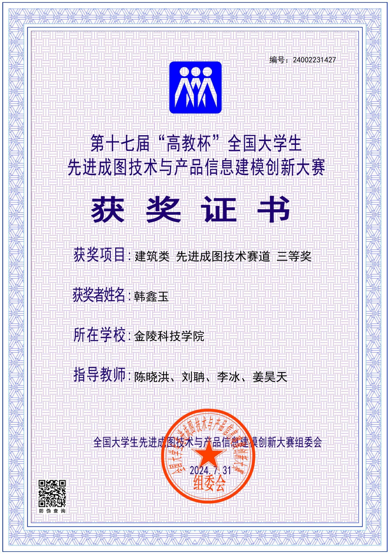 共有6位同学参加2024 年7月27日举办的第十七届全国大学生先进成图技术与产品信息建模创新大赛。经过激烈角逐,土木工程专业周祎聪、陶文昊,建筑学专业韩鑫玉在本次大赛中分别荣获二等奖1项、三等奖2项的好成绩。