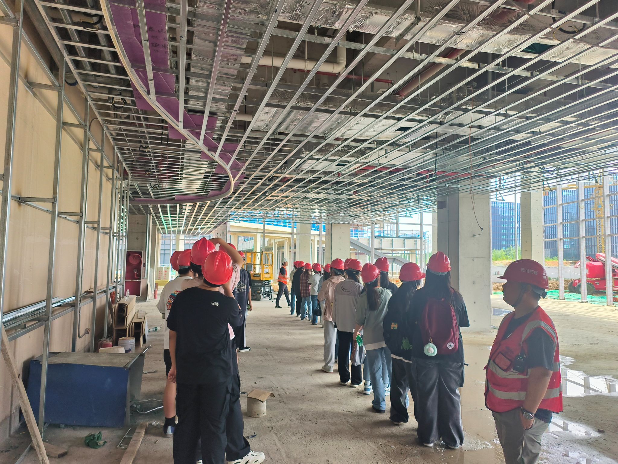 同学们依次参观了中建八局、上海宝冶集团有限公司在建或已建工程,加强学生对土木工程建造和管理全过程的了解。同学们认真聆听技术人员对于现场施工全过程和关键技术等内容的讲解以及企业发展和文化,增强了学生对房屋建筑学、施工技术、建筑材料、建设法规、建设监理等工程管理专业所学知识、技能的感性认识,为专业基础课和专业课的学习打下基础,而且了解了专业所需的工程素养。
