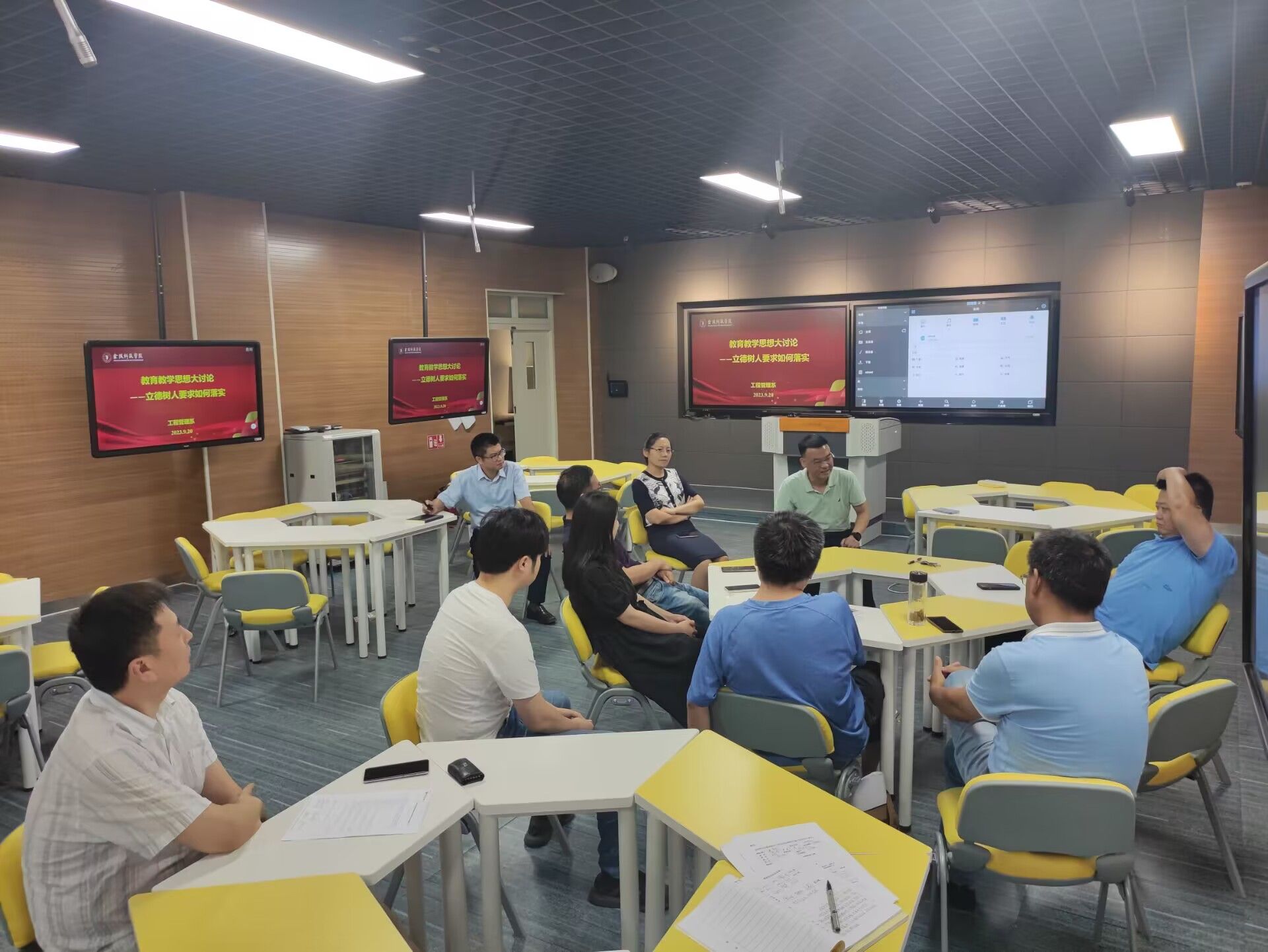 学院集中学习后,各专业就“本科教育教学审核评估教育教学思想大讨论系列活动”第一专题“立德树人要求如何落实”开展教研室活动,沈瑾书记、刘志峰院长、黄冬辉副院长一起参与各专业的大讨论,与会教师分别就主题进行发言。
