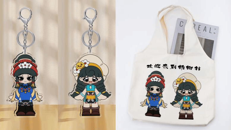 在同学们的画笔下,杨柳村的非物质文化遗产也逐渐变得生动形象。22建筑学(1)的崔子萱同学亲手创造出了“双子非遗精灵”的IP形象,穿着梅花纹打鼓服的姐姐“娃谷谷”和系着围裙头戴湖熟板鸭发箍的妹妹“板丫丫”。“这对姐妹花的灵感来源于成都娃娃鼓和湖熟板鸭的制作两个非遗文化,同时,我把杨柳村古建筑的窗棂纹样也藏在了她们的服饰里。”在IP形象诞生之后,同学们也开始探索与之相匹配的衍生产品。