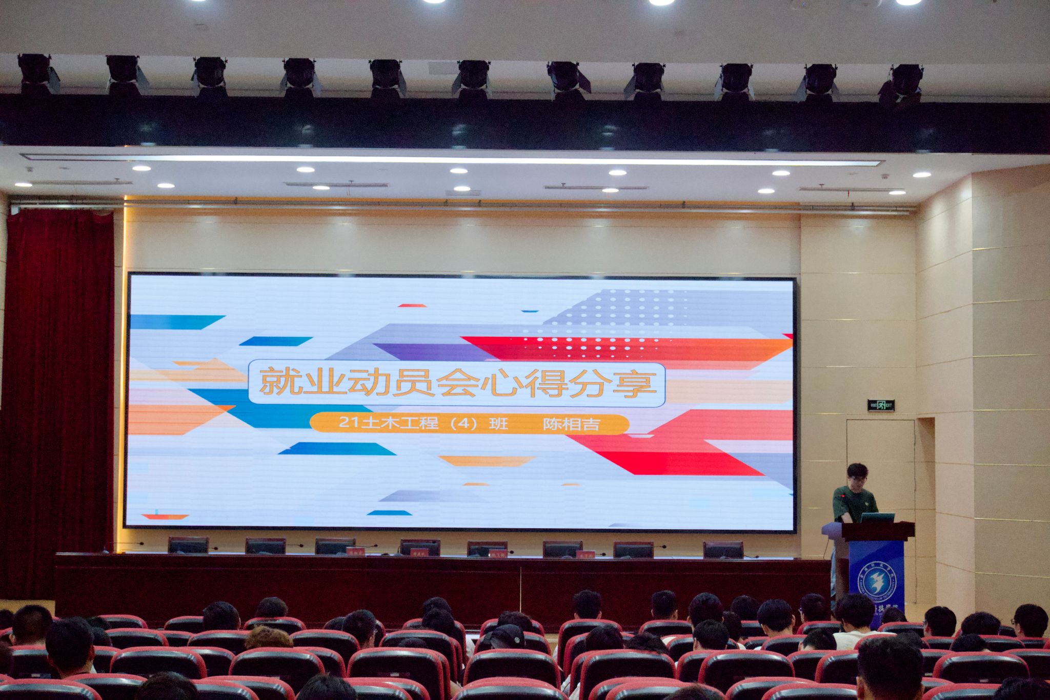 于2025年5月21日在科技楼报告厅举办就业动员会。学院党委副书记郑庆秋、学工办主任鲍飞豹及2026届全体学生共同参与,现场气氛热烈。