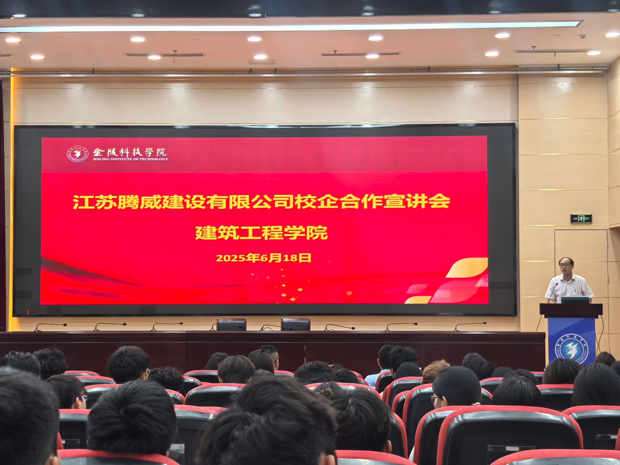 在科技楼报告厅举行与江苏腾威建设有限公司校企合作宣讲会。江苏腾威建设有限公司总经理茆金林、建工学院党委副书记郑庆秋出席会议,24级学生代表参加会议。宣讲会由院学工办主任鲍飞豹主持。