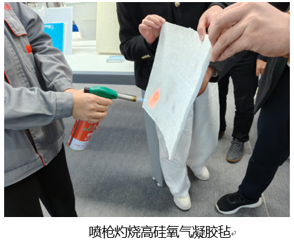 其中,高硅氧气凝胶毡的现场演示成为最大亮点:技术人员手持千度高温喷枪对准材料表面,火焰灼烧下毡体轻微泛黑,无冒烟、无变形;演示结束后,在技术人员的指导下,同学们小心翼翼触摸毡体另一侧,纷纷表示:完全感受不到高温,只有温和的触感。与课本里气凝胶材料极低导热系数的理论知识对应,这一直观体验,全方位呈现了该材料在基建防火、工业保温等领域的应用价值。