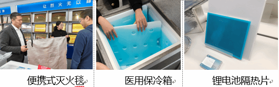展示区的高硅氧气凝胶毡、灭火毯(耐高温、易便携,适用于应急消防场景)、气凝胶纳米绝热板(超薄结构,适配精密设备保温)、建筑真空绝热板(低能耗,契合绿色建筑需求)、异形真空绝热板(定制化造型,解决复杂工况适配难题),以及应用于医用领域的保冷箱(精准控温,保障生物试剂运输安全)、服务新能源汽车行业的锂电池隔热片(阻隔热失控,提升电池安全性)等产品,全面覆盖了土木水利、医疗、新能源等多领域,让同学们看到了新材料技术与实体经济的深度融合。