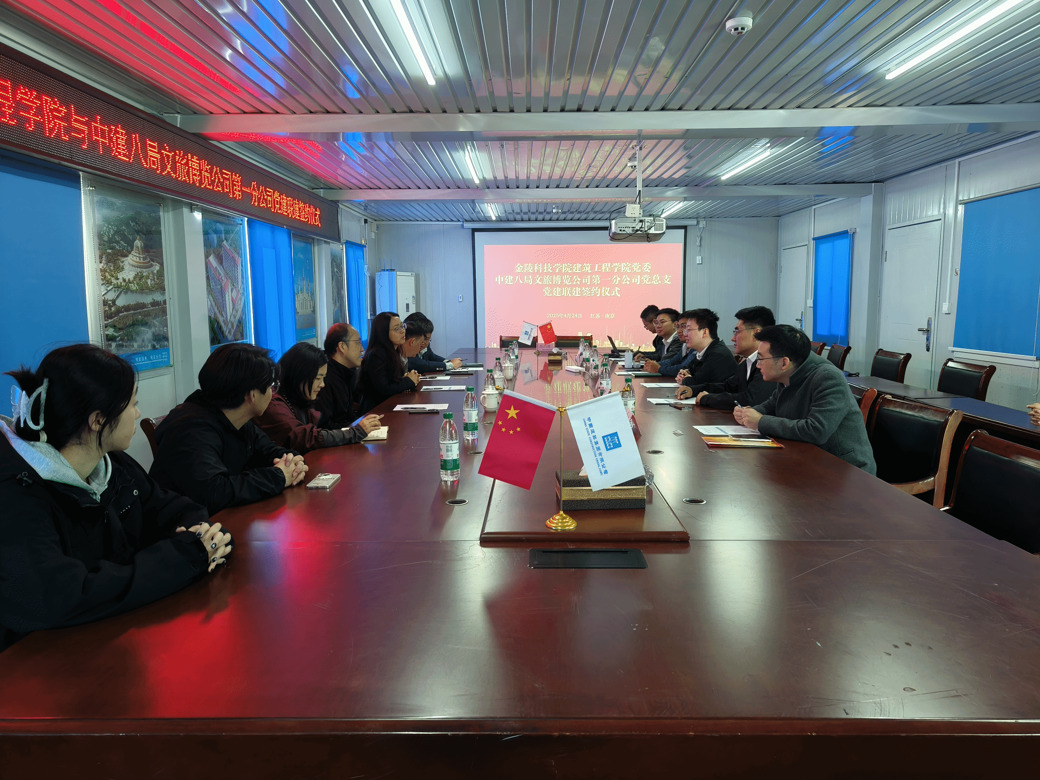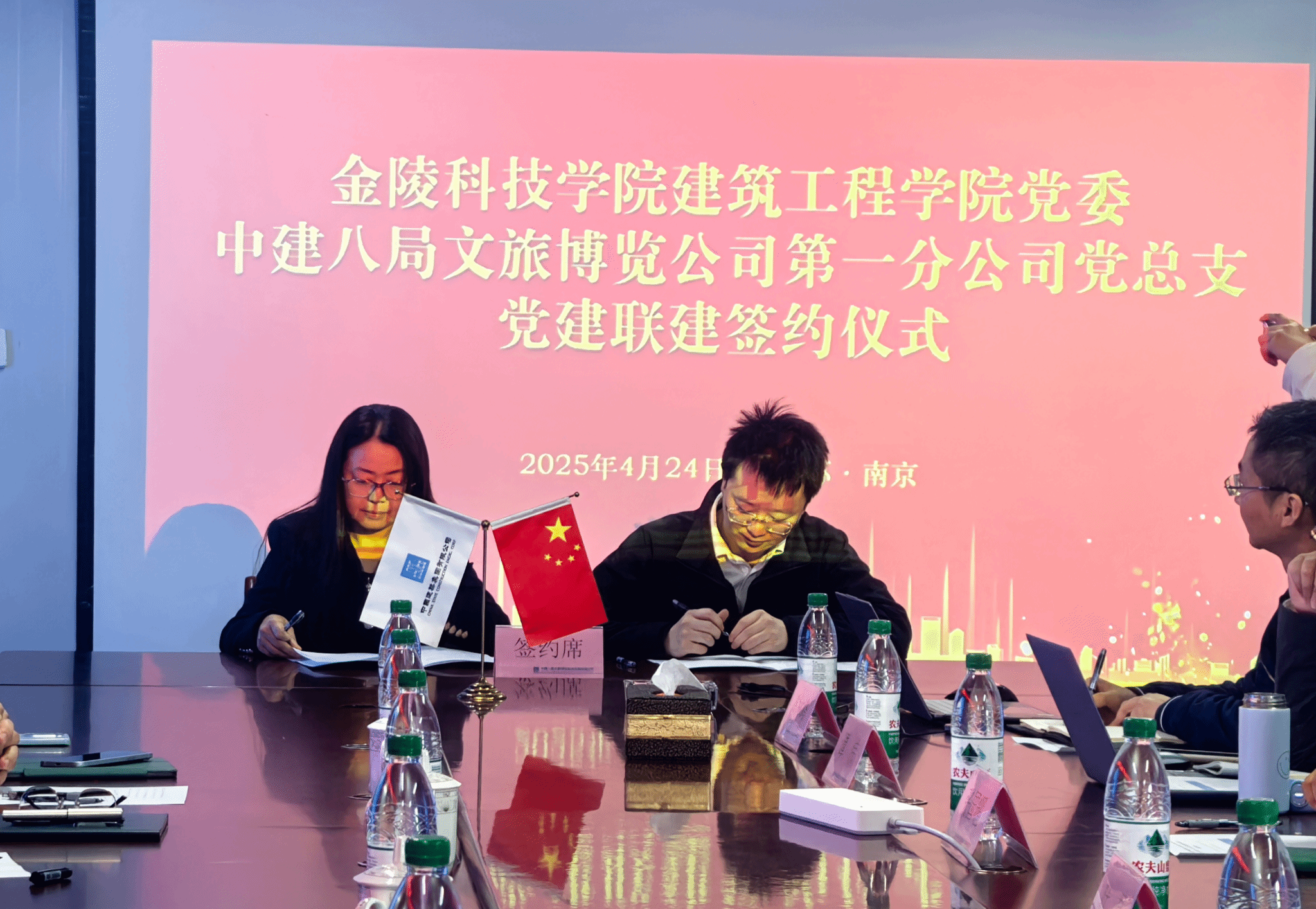 新建江宁校区学生宿舍项目施工总承包单位——中国建筑第八工程局有限公司文旅博览公司开展座谈交流。本次活动聚焦党建引领、人才培养与古建保护领域合作,双方就多项事宜达成共识,并现场签署合作协议。