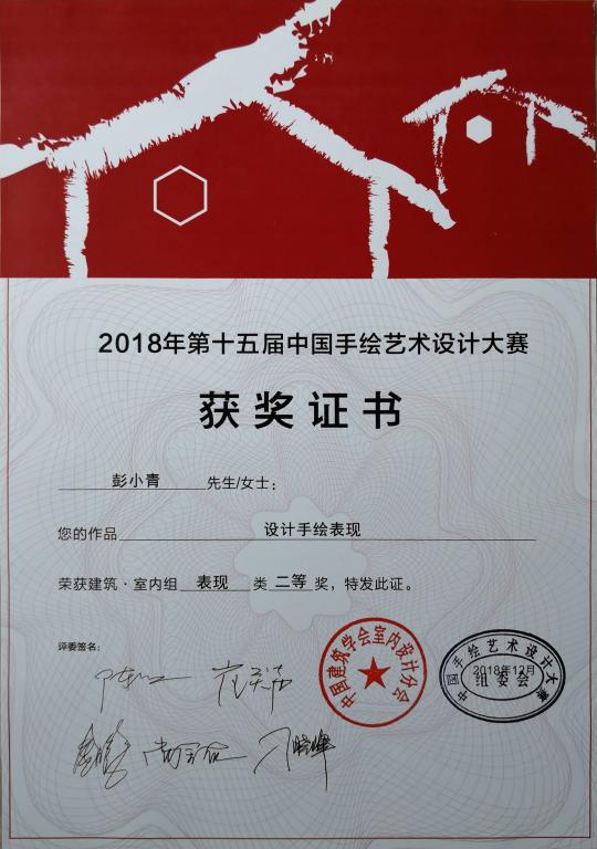 彭小青老师荣获手绘艺术设计大赛专业组设计表现类二等奖。
