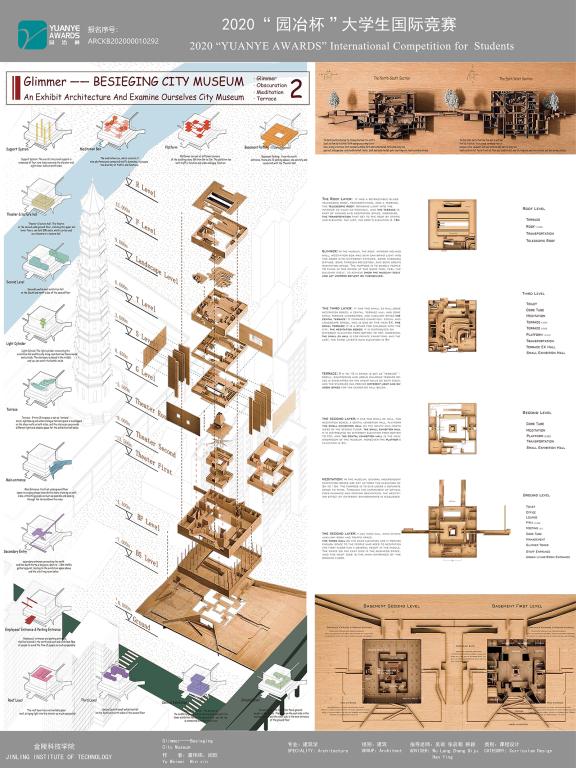共获得10项大奖。其中虞伟炜、闵欣同学提交的“GLIMMER-BESIEGING CITY MUSEUM”获得一等奖,陈港回同学提交的“秦淮记忆-基于追溯‘慢生活’节奏而做的历史文化街区设计”和陈莹、杜晓芳、吴怡同学提交的“定制森林2048-青年群体未来可持续模块化社区设计”获得三等奖,另获7项荣誉奖。