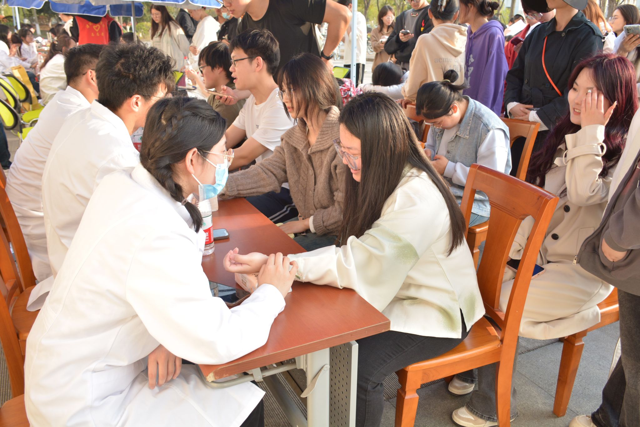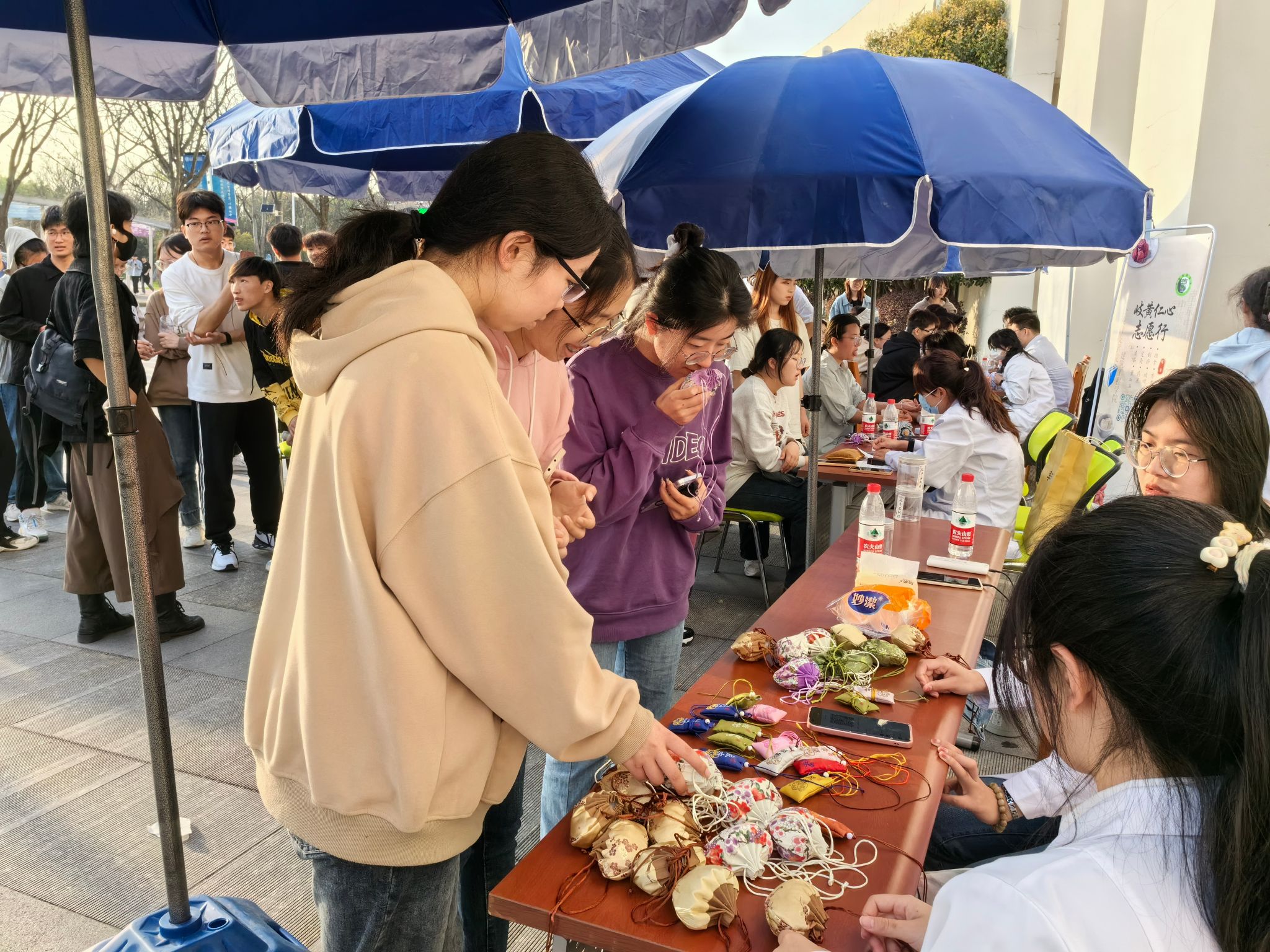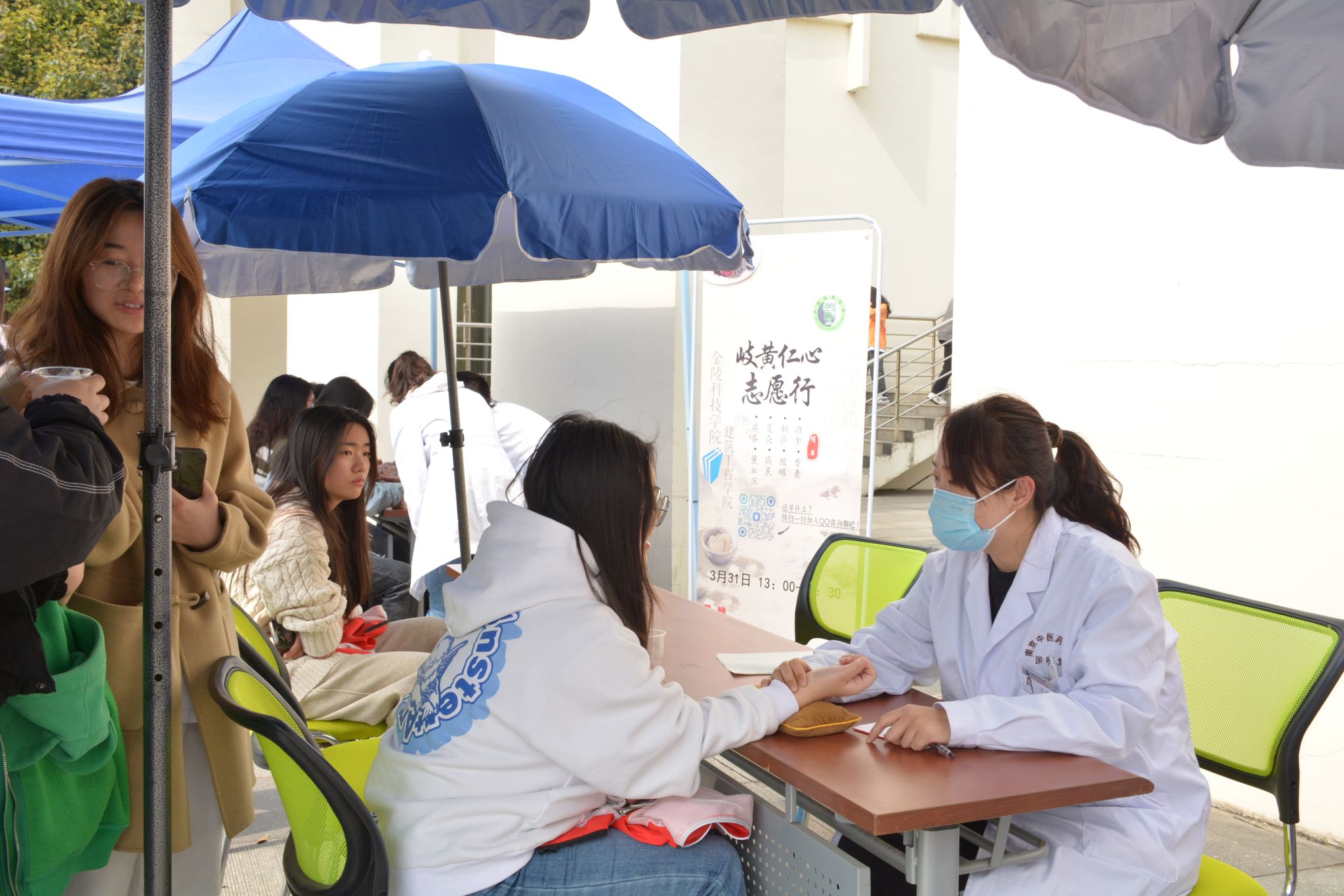 江宁校区开展医疗志愿进校园活动。南京中医药大学的志愿者为金科院学生提供了量血压、香囊制作、推拿、艾灸、品尝花茶等服务,中医学科的魅力吸引了大批同学前来体验学习。