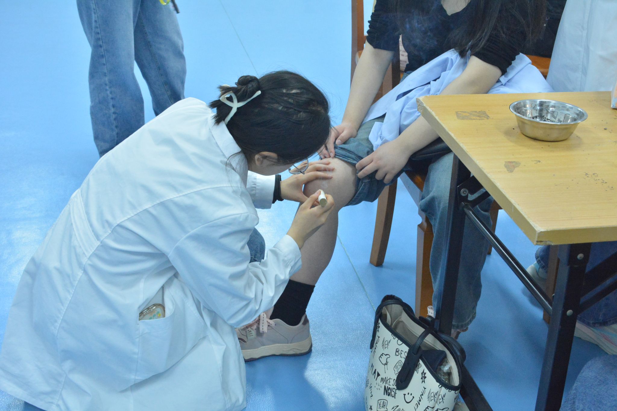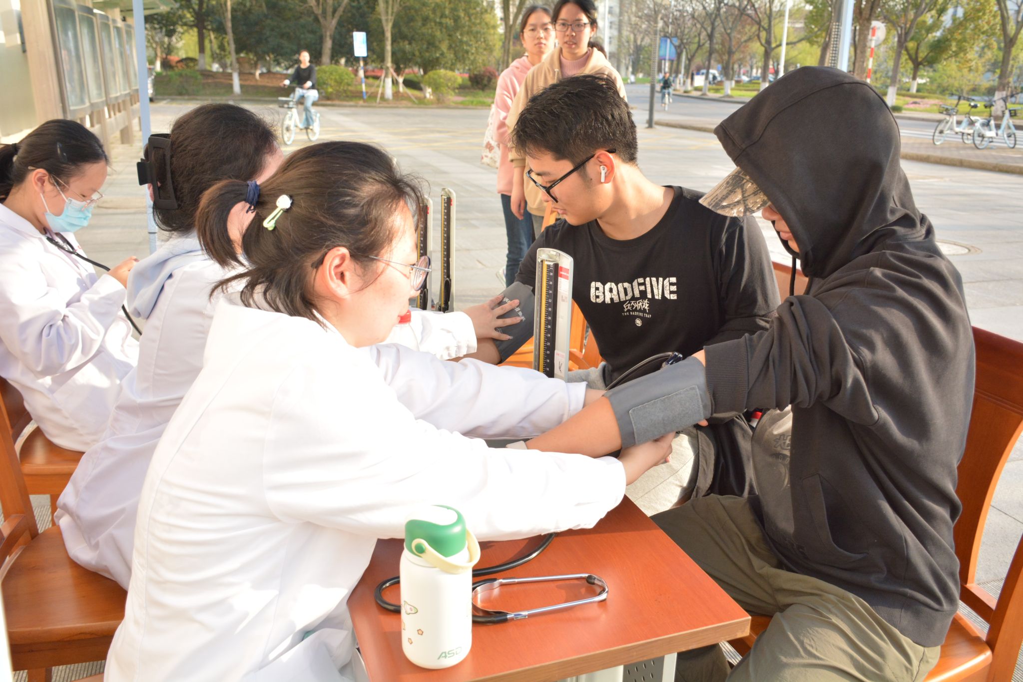 就诊同学量血压、细致地讲解了药材的作用,并推荐了几种适合大部分同学的配方。由于同学们常常久坐上课、低头学习,腰部与肩颈不适的状况时有发生。义诊志愿者针对此问题,为香蕉视频
