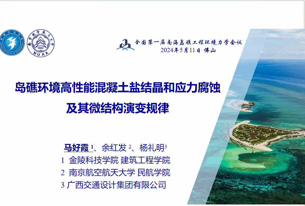 会议期间马好霞老师就我国岛礁工程混凝土材料/结构力学性能及其在南海环境的劣化等研究领域与行业专家进行学术交流,并针对“岛礁环境高性能混凝土盐结晶和应力腐蚀及其微结构演变规律”做学术报告。本次报告系统的阐述了抗腐蚀混凝土制备技术、氯离子扩散行为、钢筋锈蚀行为以及混凝土服役寿命预测方法。