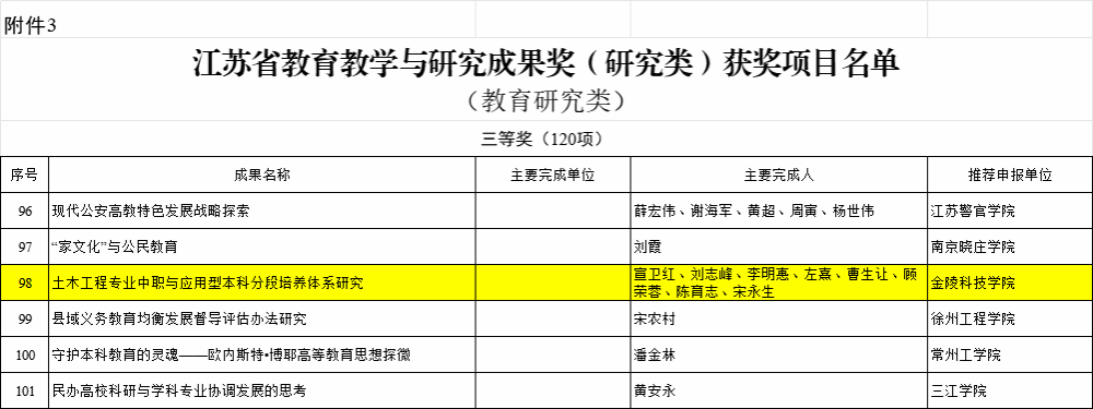 香蕉视频 “土木工程专业中职与应用型本科分段培养体系研究”项目获2018年江苏省教育教学与研究成果奖(研究类)(教育研究类)三等奖;香蕉视频 左熹、毛昆明老师参与的“一体化榫接复合保温墙关键技术创新及其应用”项目获2018年江苏省教育教学与研究成果奖(研究类)(高校自然科学研究类)三等奖。