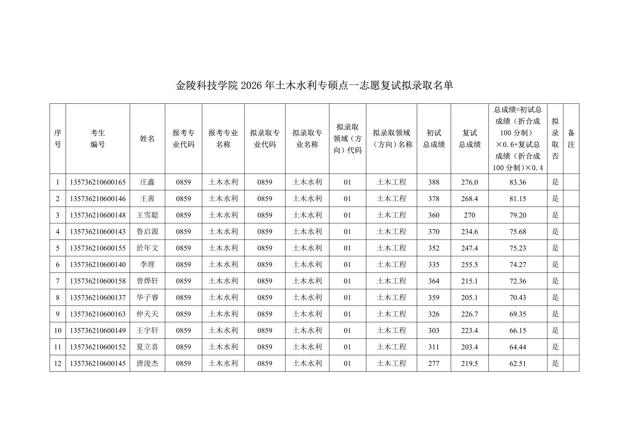 附:香蕉视频 2026年土木水利专硕点一志愿复试拟录取名单