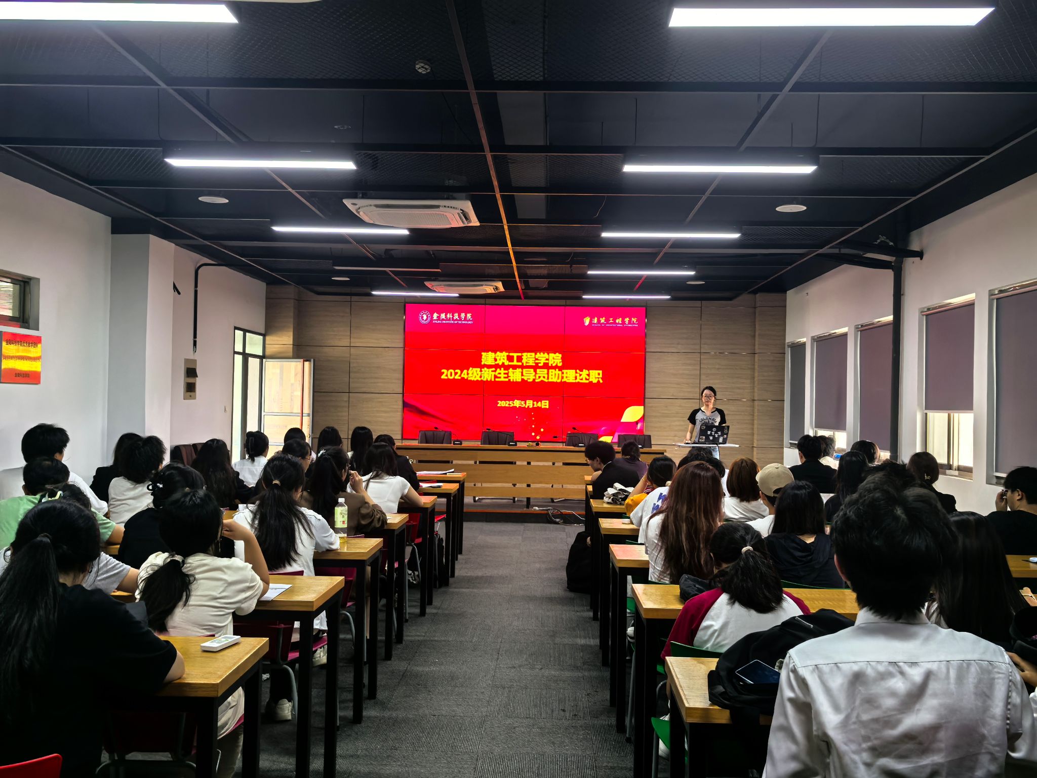 在工科楼b513举行2024级新生辅导员助理述职会。学院学工办主任鲍飞豹、团总支书记、学工办副主任鲁瑶、24级新生辅导员李俊儒、孙宏参会、2024级新生班级助理及学生代表共100余人参加会议。