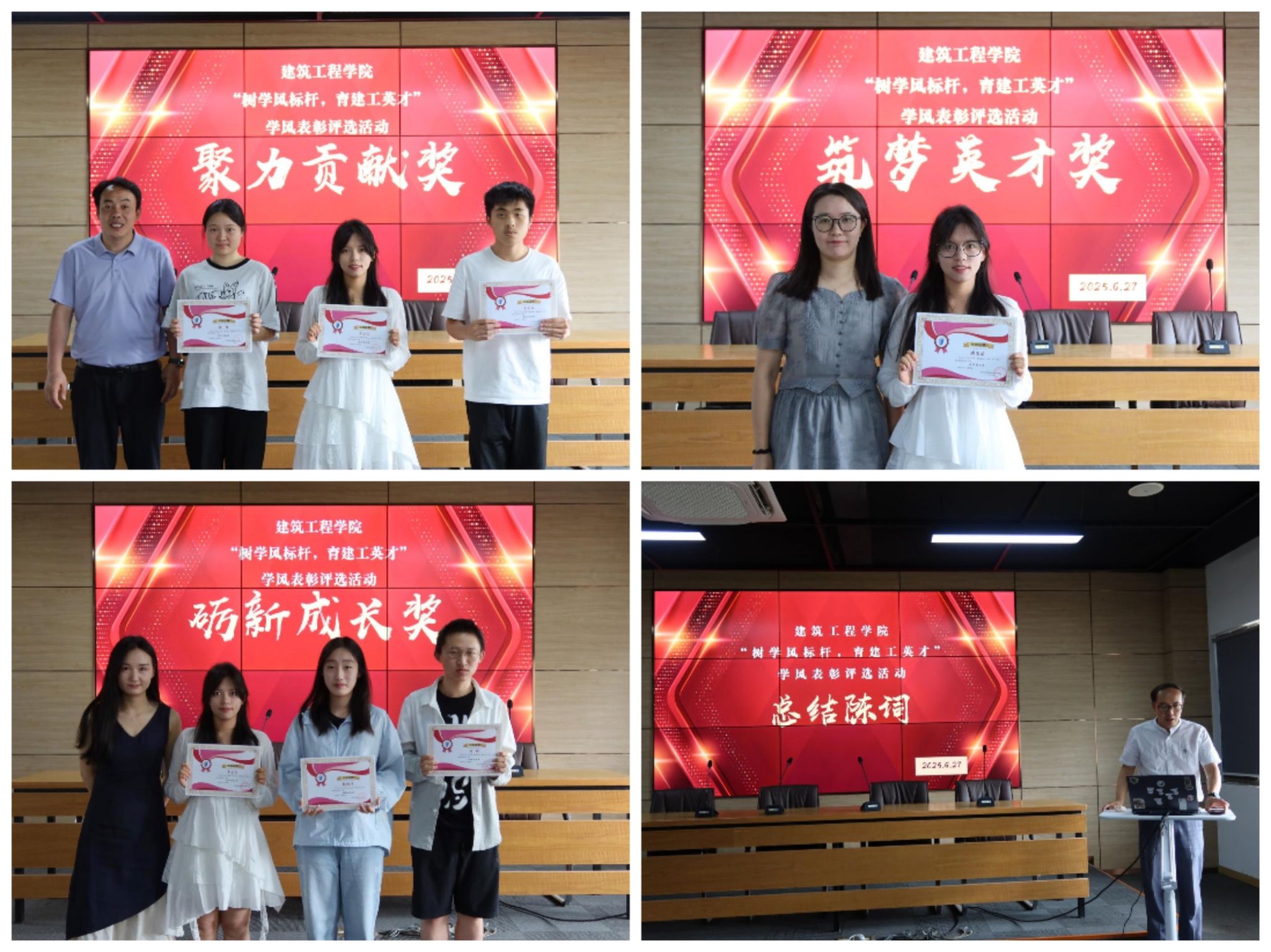 经学生会学习部检查、学院审核评选推荐,最终决定授予优秀学生筑梦英才奖5名,砺新成长奖57名,聚力贡献奖3名,学风标杆班级1个。22城市地下空间工程班刘峰、22建筑学(1)班涂立群作为学生代表分享了学习心得,他们强调要重视专业课、把握科研竞赛机遇、劳逸结合善用日常规划,并结合各自在专利论文撰写与专业竞赛中突破认知、掌握方法、团队协作的实践经历,鼓励大家以热爱驱动多元发展,在大学学习与生活中找准方向、收获成长。