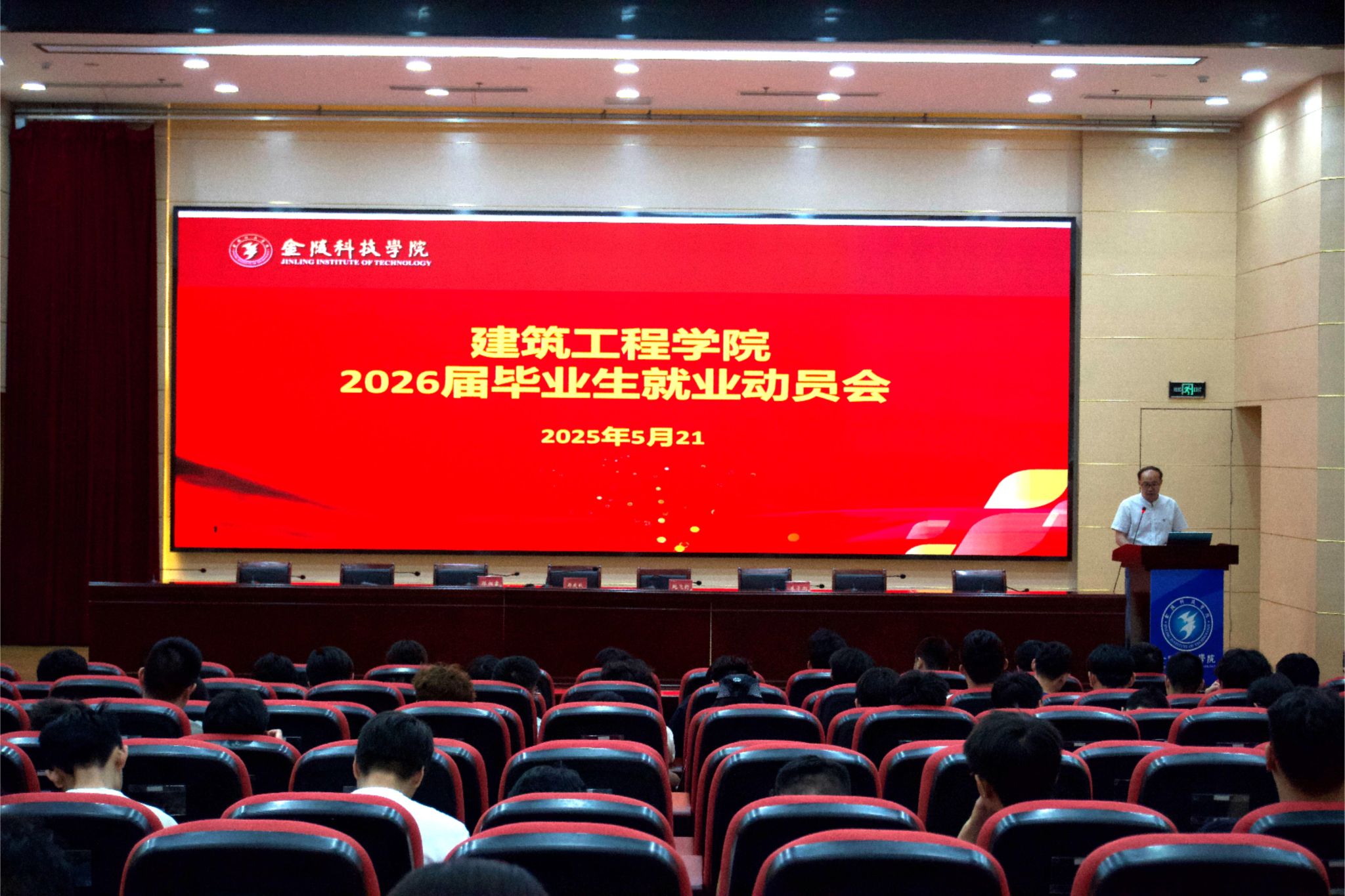 于2025年5月21日在科技楼报告厅举办就业动员会。学院党委副书记郑庆秋、学工办主任鲍飞豹及2026届全体学生共同参与,现场气氛热烈。