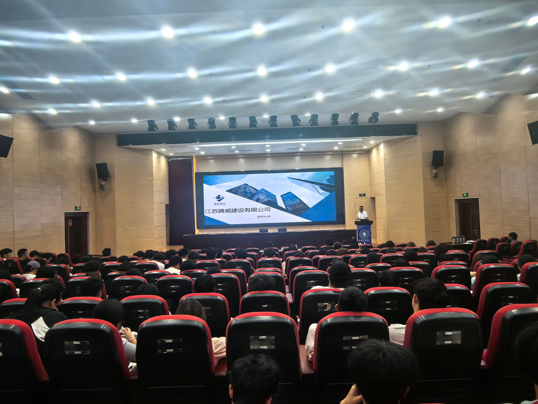 在科技楼报告厅举行与江苏腾威建设有限公司校企合作宣讲会。江苏腾威建设有限公司总经理茆金林、建工学院党委副书记郑庆秋出席会议,24级学生代表参加会议。宣讲会由院学工办主任鲍飞豹主持。