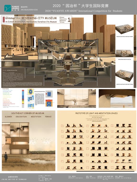 共获得10项大奖。其中虞伟炜、闵欣同学提交的“GLIMMER-BESIEGING CITY MUSEUM”获得一等奖,陈港回同学提交的“秦淮记忆-基于追溯‘慢生活’节奏而做的历史文化街区设计”和陈莹、杜晓芳、吴怡同学提交的“定制森林2048-青年群体未来可持续模块化社区设计”获得三等奖,另获7项荣誉奖。