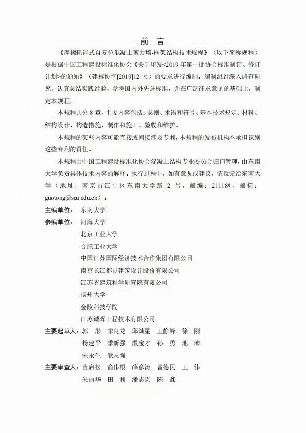 本规程编制根据摩擦耗能式自复位混凝土剪力墙-框架结构所涉及的基本技术规定、材料、结构设计、构造措施、制作和施工、验收和维护等行业技术需求,研究团队经过10余年系统调研、理论分析、试验验证和工程应用实践总结,通过专家鉴定,为规范编制奠定了坚实的科学理论和应用实践基础,为摩擦耗能式自复位混凝土剪力墙-框架结构的技术应用提供规程依据。