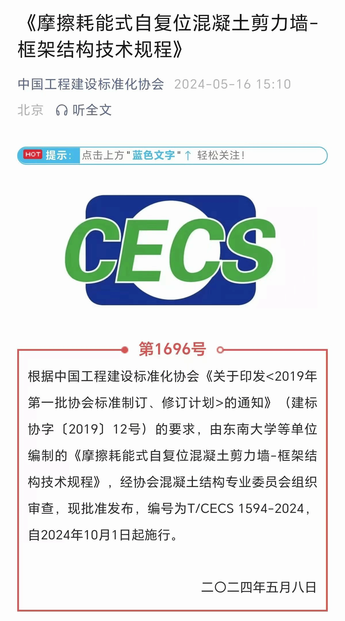 等单位参编的《摩擦耗能式自复位混凝土剪力墙-框架结构技术规程》(T/CECS1594-2024)批准发布,自2024年10月1日起施行。