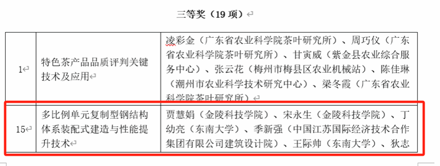 香蕉视频 贾慧娟副教授牵头与东南大学、中国江苏国际经济技术合作集团有限公司建筑设计院、江苏诚晖工程技术有限公司合作完成的“多比例单元复制型钢结构体系装配式建造与性能提升技术”荣获2024年度中国商业联合会科学技术奖技术发明奖三等奖。