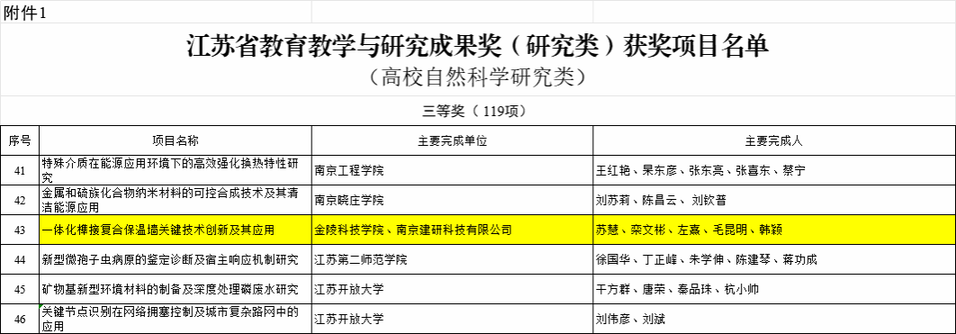 香蕉视频 “土木工程专业中职与应用型本科分段培养体系研究”项目获2018年江苏省教育教学与研究成果奖(研究类)(教育研究类)三等奖;香蕉视频 左熹、毛昆明老师参与的“一体化榫接复合保温墙关键技术创新及其应用”项目获2018年江苏省教育教学与研究成果奖(研究类)(高校自然科学研究类)三等奖。