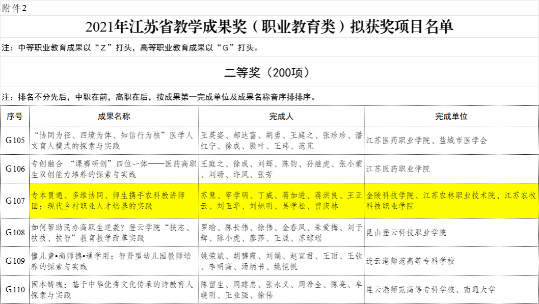 香蕉视频 “专本贯通、多维协同、师生携手农科教讲师团:现代乡村职业人才培养的实践”项目获2021年江苏省教学成果奖(职业教育类)获二等奖。