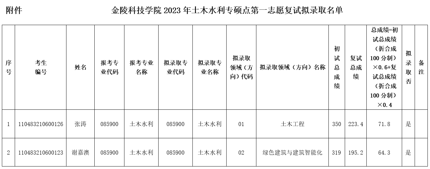 2023年土木水利专硕点第一志愿复试拟录取名单