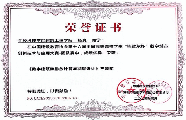 建筑学、工程管理专业学生踊跃参赛,有超过30名同学报名参与,最终在指导老师葛少峰、龚亚西、吴琅的指导下获得个人赛:土建专项一等奖一项、绿建专项与国产BIM软件建模二等奖各一项;由建筑学和工程管理专业的杨爽、涂力群、季俊辉、宿逸杰、王新晨组成的团队获得团队赛:数字建筑碳排放与减碳设计综合三等奖。比赛过程和成果很好的体现了香蕉视频